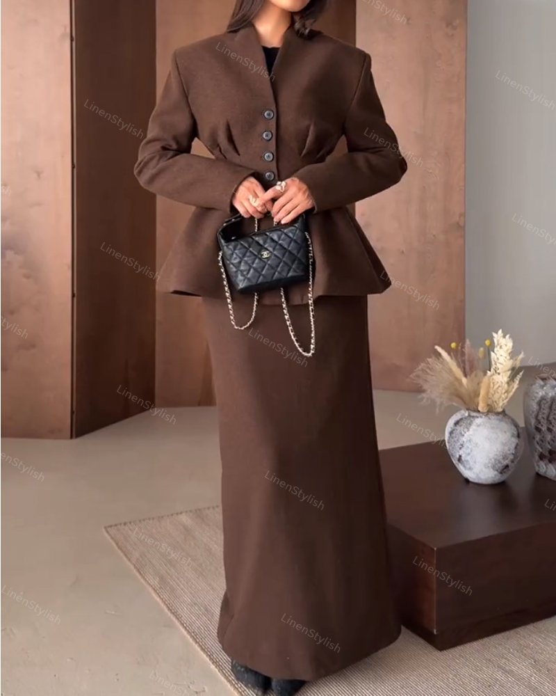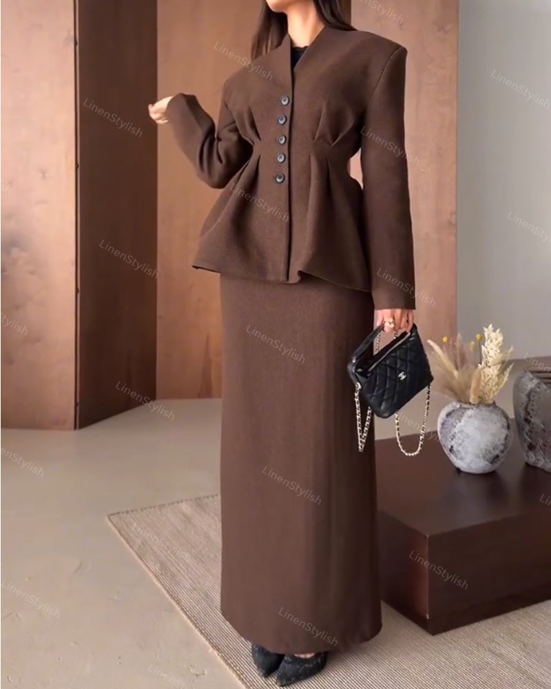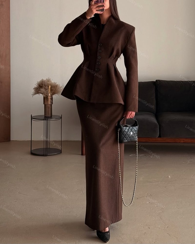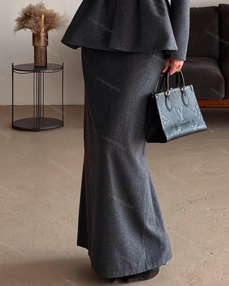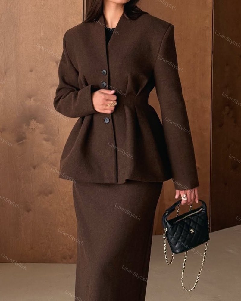 Der einfache und klassische Schnitt sowie die neutrale Farbe ermöglichen es, das Set leicht an verschiedene Accessoires und Stile anzupassen. Die Jacke und der Rock können zusammen oder separat getragen werden, wodurch viele moderne Kombinationen entstehen. Es ist ein zeitloses Set, das immer elegant und modern aussieht.