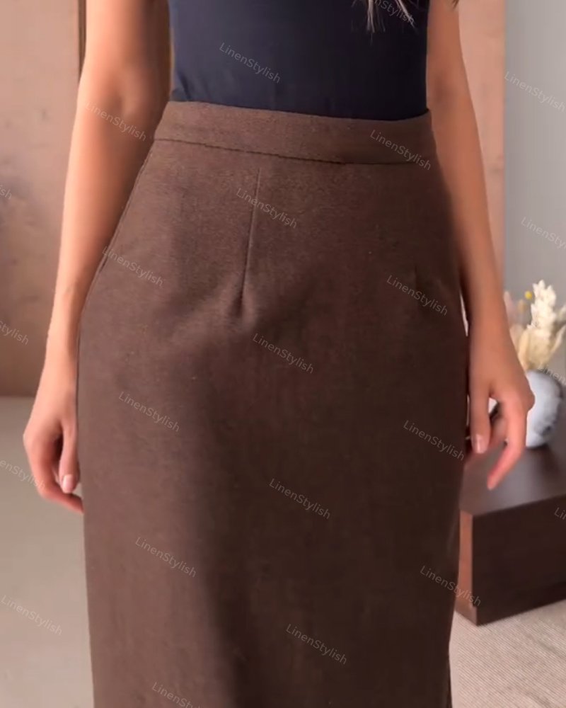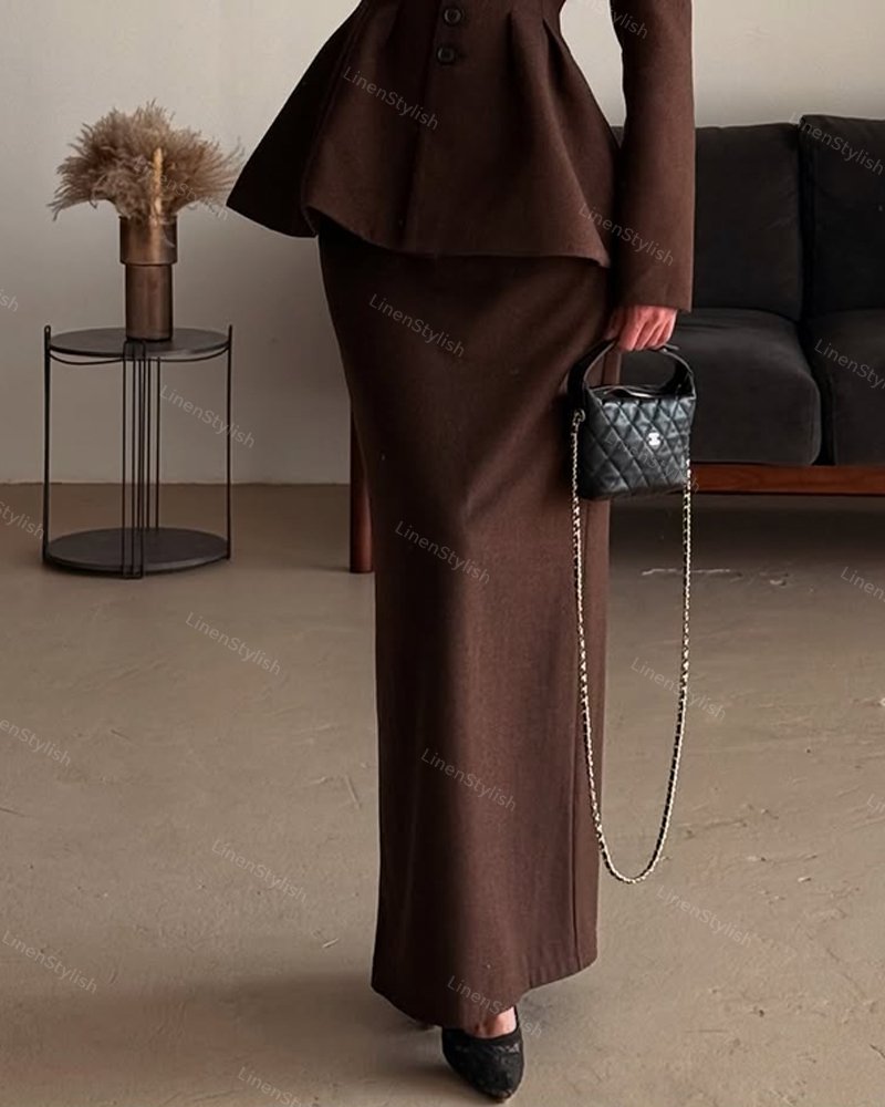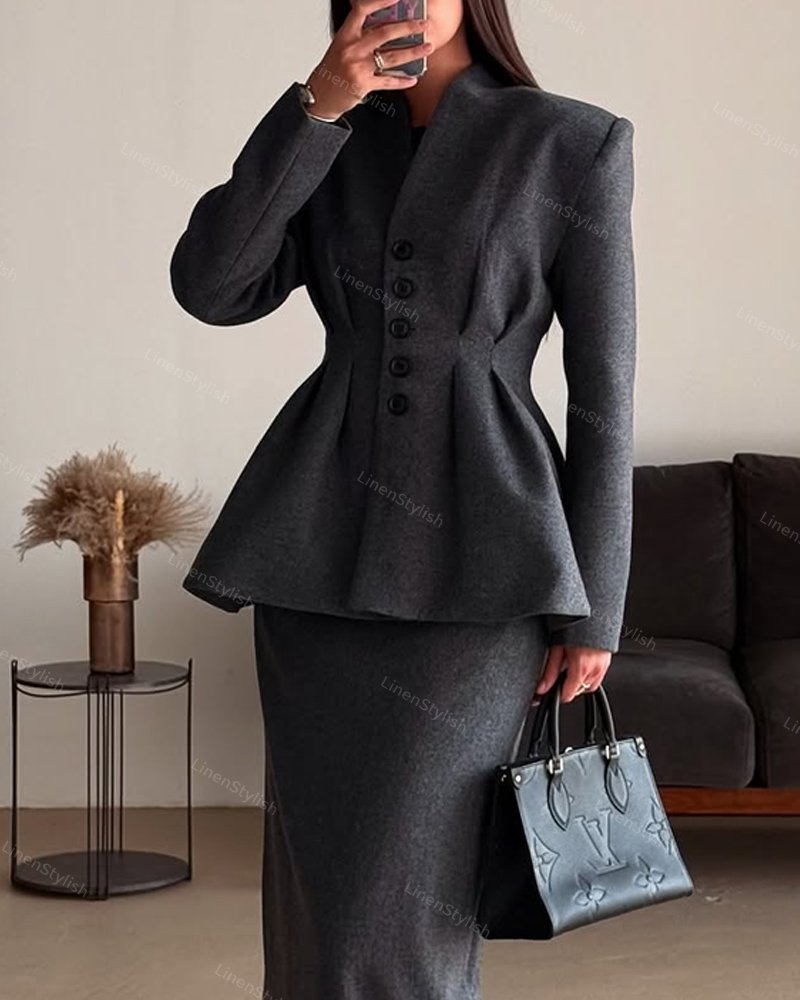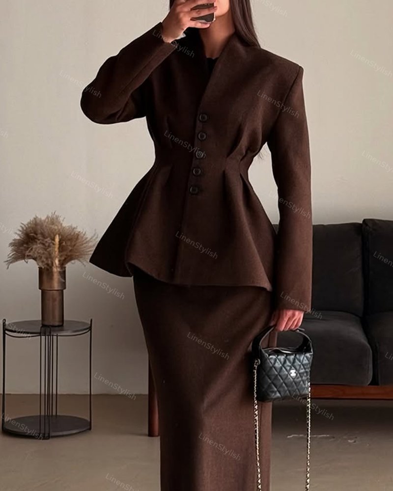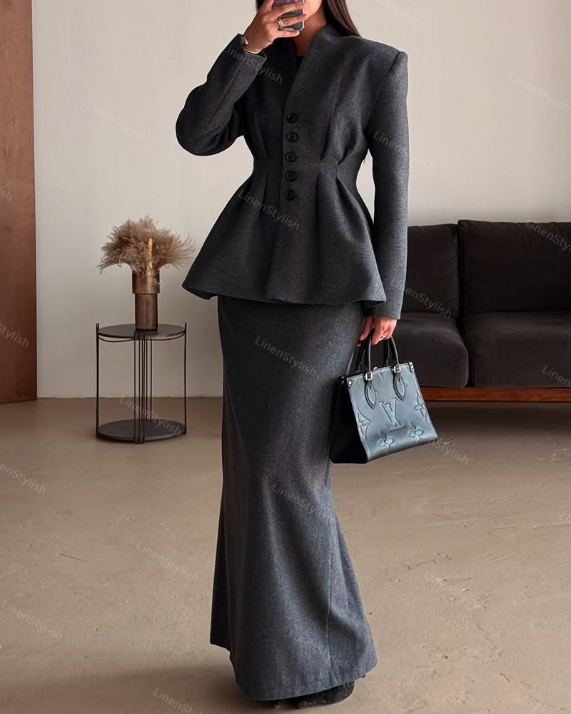 Der einfache und klassische Schnitt sowie die neutrale Farbe ermöglichen es, das Set leicht an verschiedene Accessoires und Stile anzupassen. Die Jacke und der Rock können zusammen oder separat getragen werden, wodurch viele moderne Kombinationen entstehen. Es ist ein zeitloses Set, das immer elegant und modern aussieht.