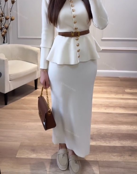Dieses Strickset mit Top und Rock strahlt elegante Subtilität und modernen Minimalismus aus. Die weiche Textur des Materials hebt die Silhouette hervor und sorgt gleichzeitig für Leichtigkeit und Freiheit. Eine ideale Wahl für tägliche Ausflüge, Meetings oder entspannende Momente außerhalb des Hauses.